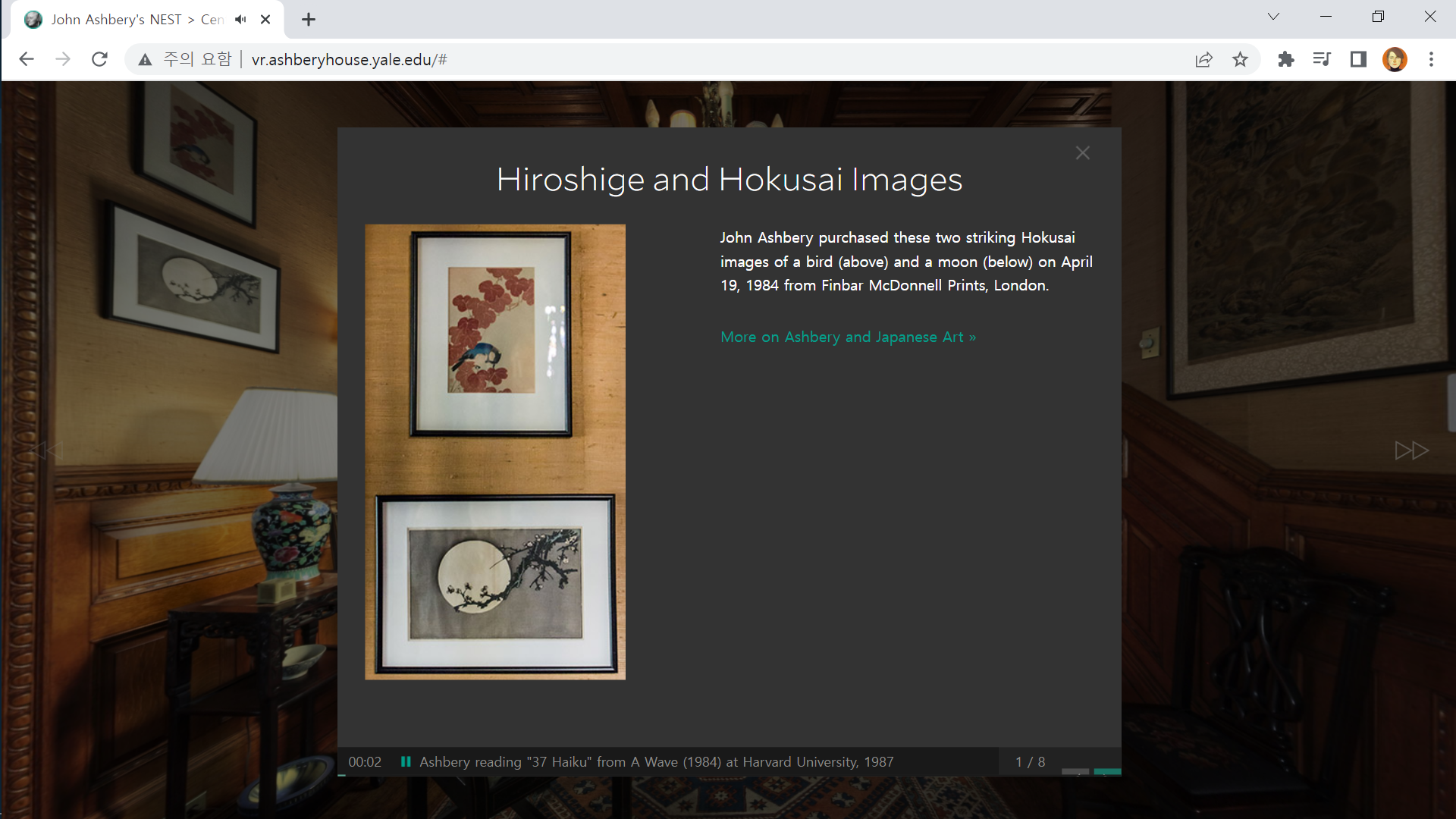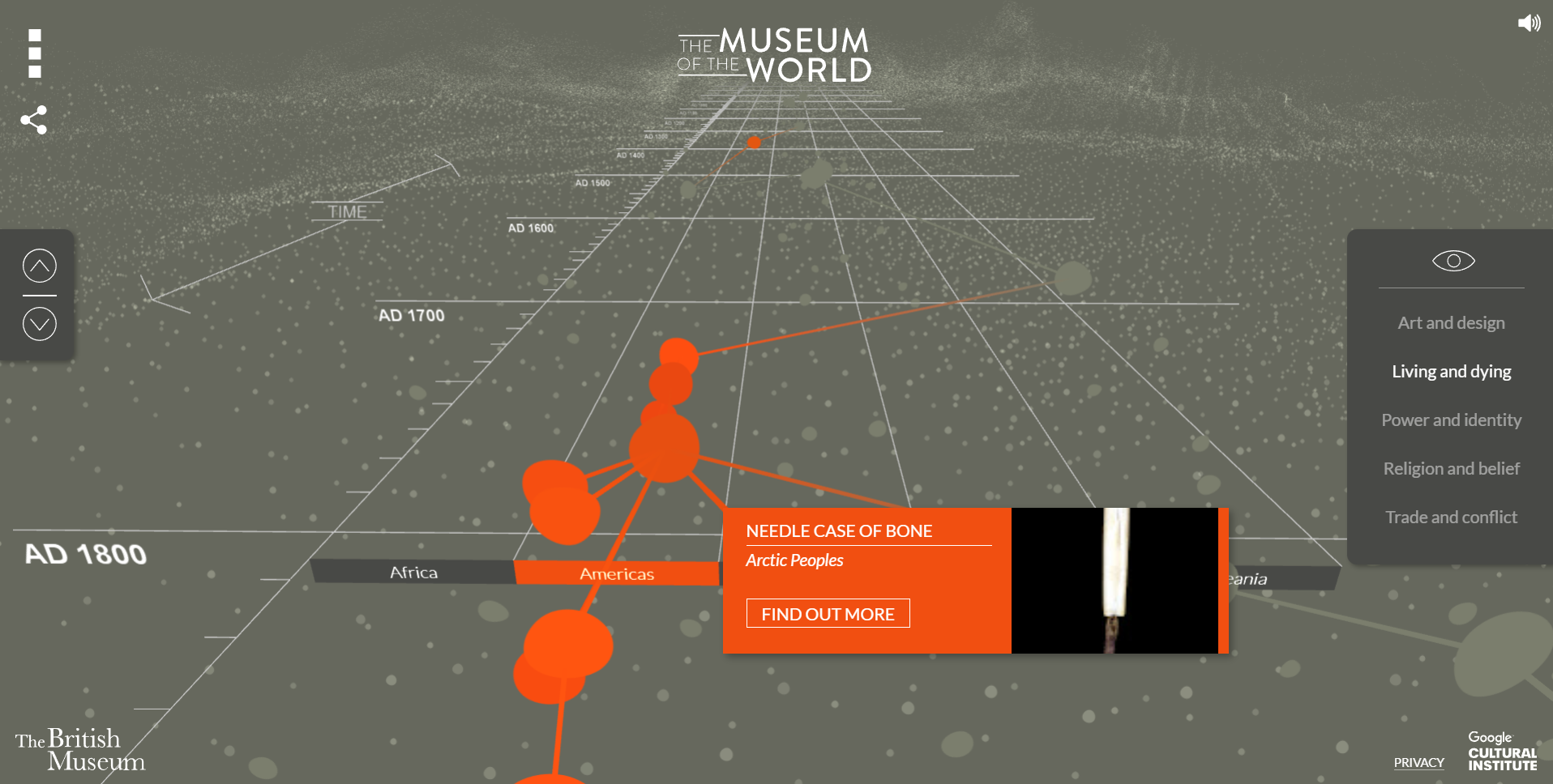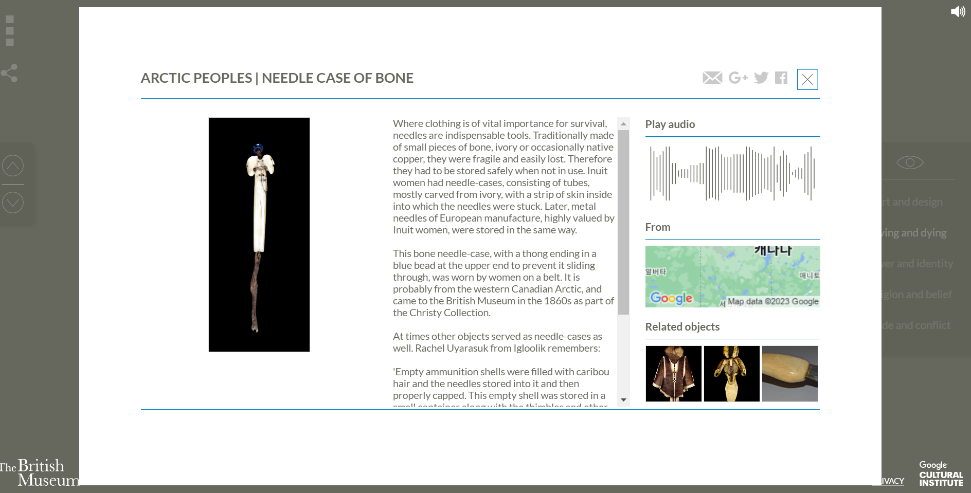 점으로 표시된 특정 시점, 특정 지역의 소장품을 클릭하여 상세 정보 및 유관 소장품 조회 가능